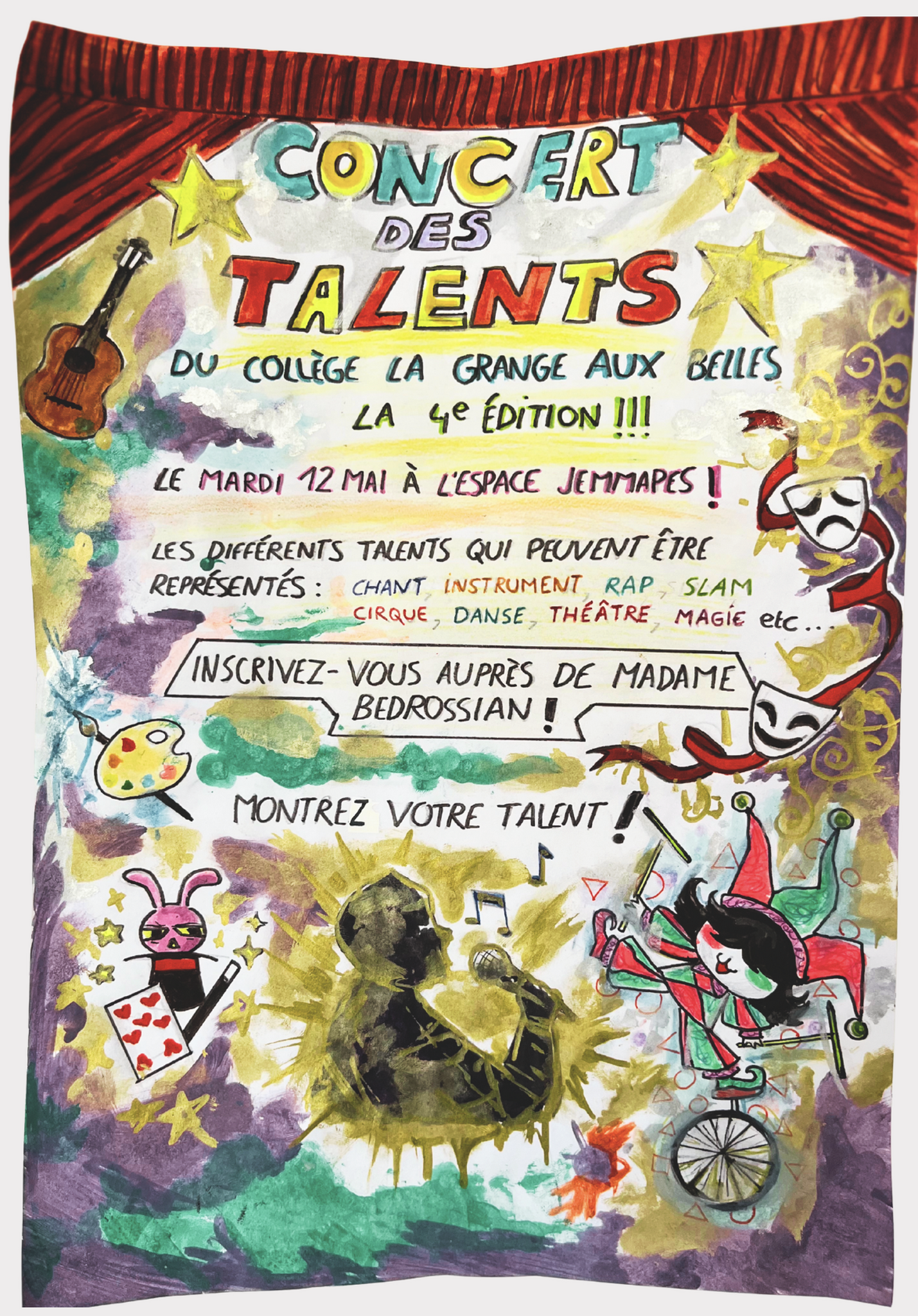 Danse, cirque, théâtre, magie, rap, slam, poésie, gym, chant, instrument... Élèves stressés qui attendent devant la salle de musique ou la salle d’EPS... De quoi parle-ton ? Du concert des talents évidemment!