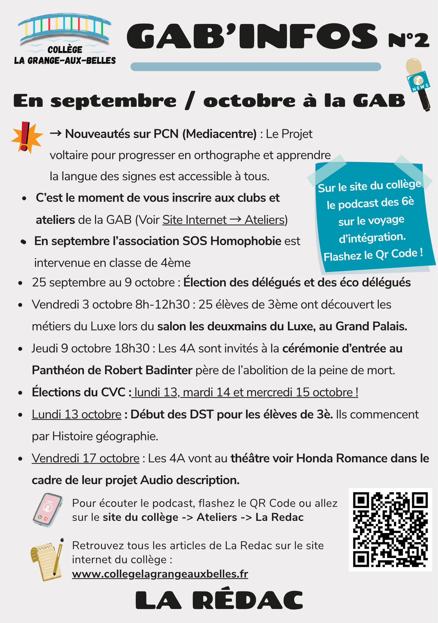 En 2025 - 2026, l'équipe s'est agrandie avec 22 élèves participants à l'atelier. Déjà plus de 10 articles rédigés depuis la rentrée, une équipe d'ancien qui aide à former les plus jeunes. Cette année a vu la création d'un format reportage pour des podcasts de 5 minutes une fois par mois et la diffusion du premier GAB'INFOS de l'année en format papier et Internet.